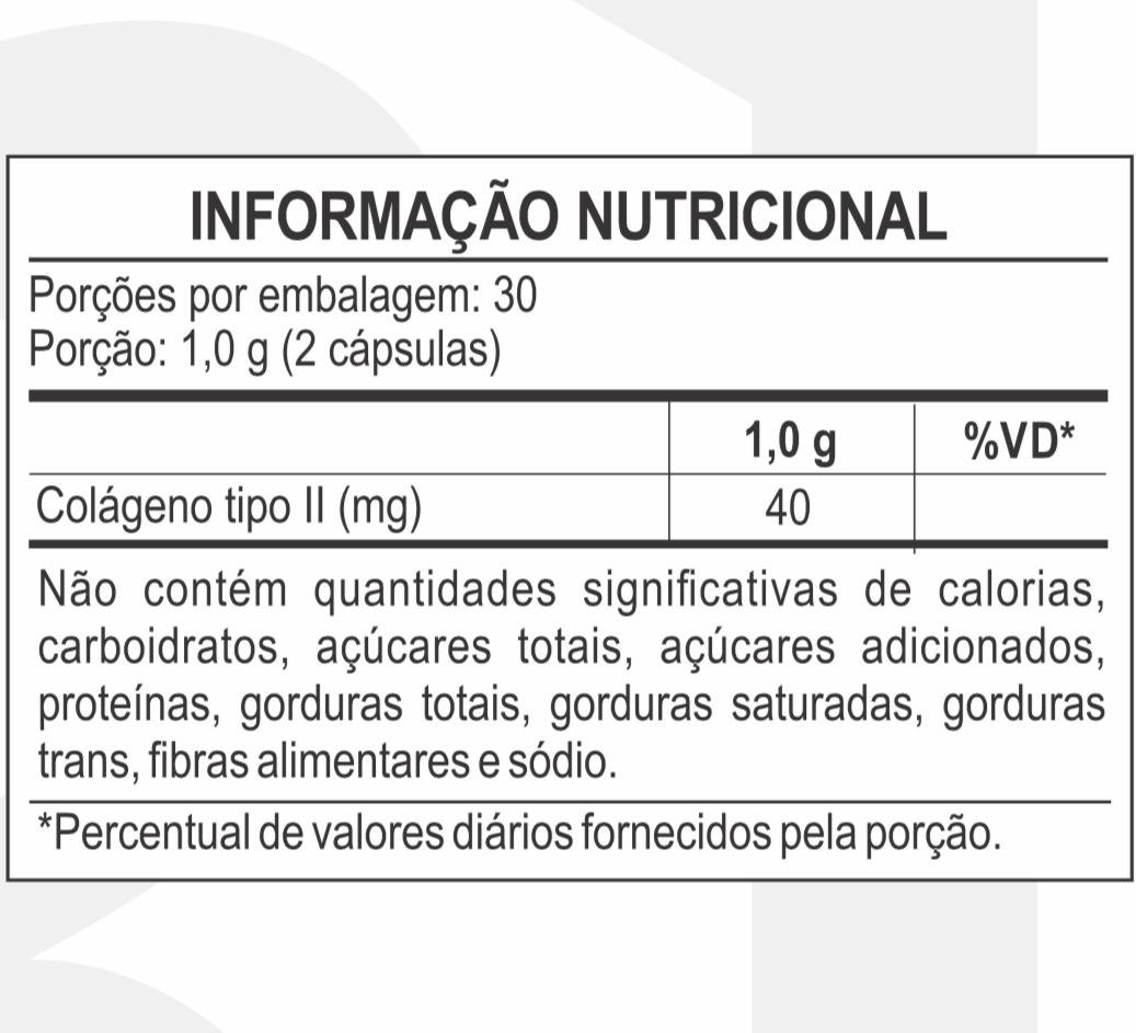 Suplemento com colágeno tipo II não desnaturado, ideal para a saúde das articulações, flexibilidade e proteção da cartilagem.