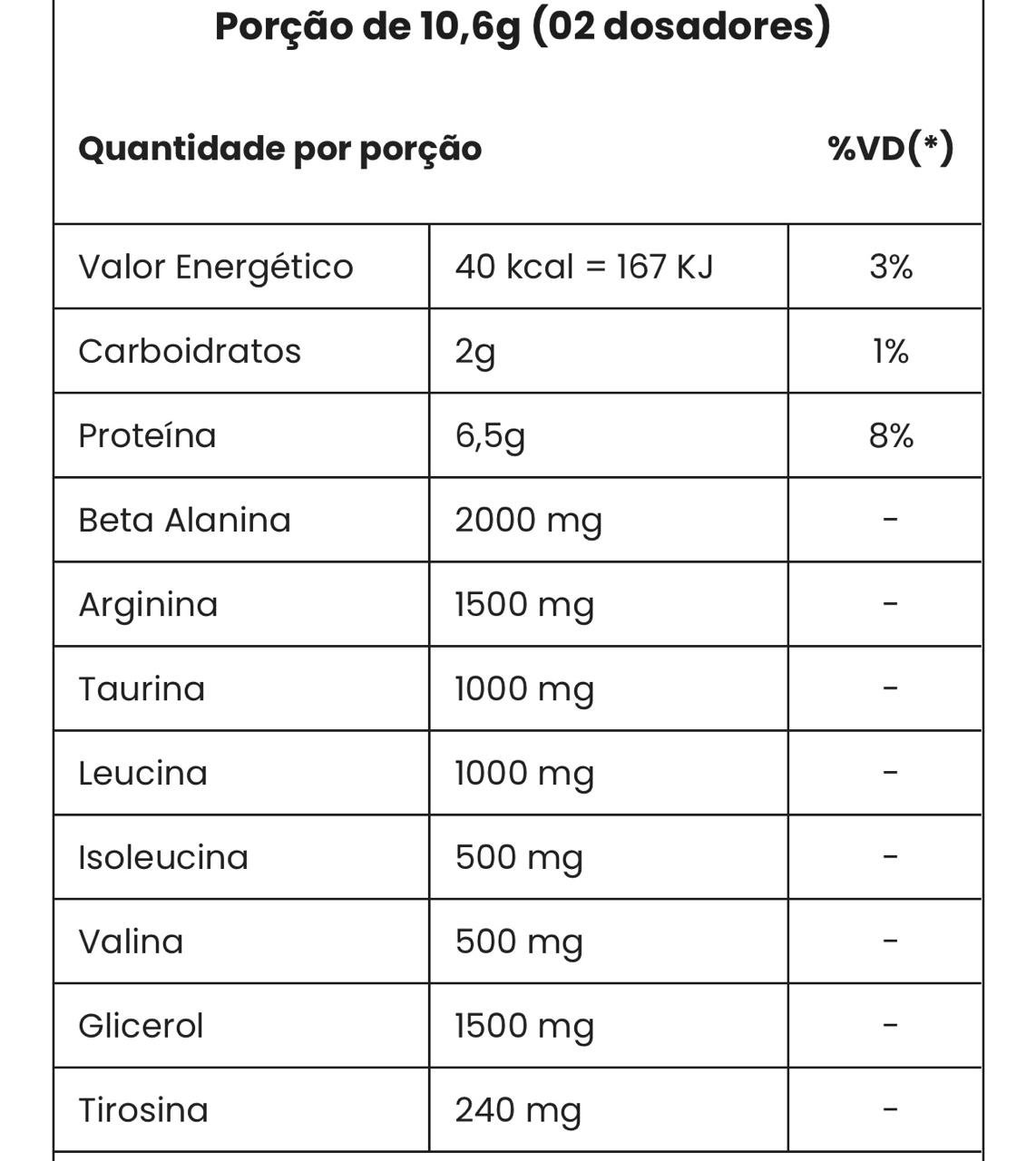 Ingredientes: Beta alanina, Arginina, Taurina, Glicerol em pó, Leucina, Isoleucina, Valina, Tirosina, Maltodextrina, Aroma identico ao natural de maçã verde, Ácido cítrico, Edulcorante sucralose, corante amarelo 5 e azul. NÃO CONTÉM GLÚTEN.