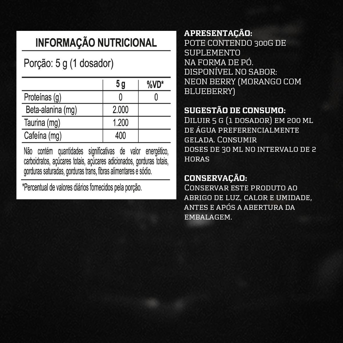 Sua fórmula contém ingredientes energéticos e neuroestimulantes capazes de criar as condições físicas adequadas à realização de treinos intensos, retardando o desgaste físico e mantendo o alerta mental do início ao fim.