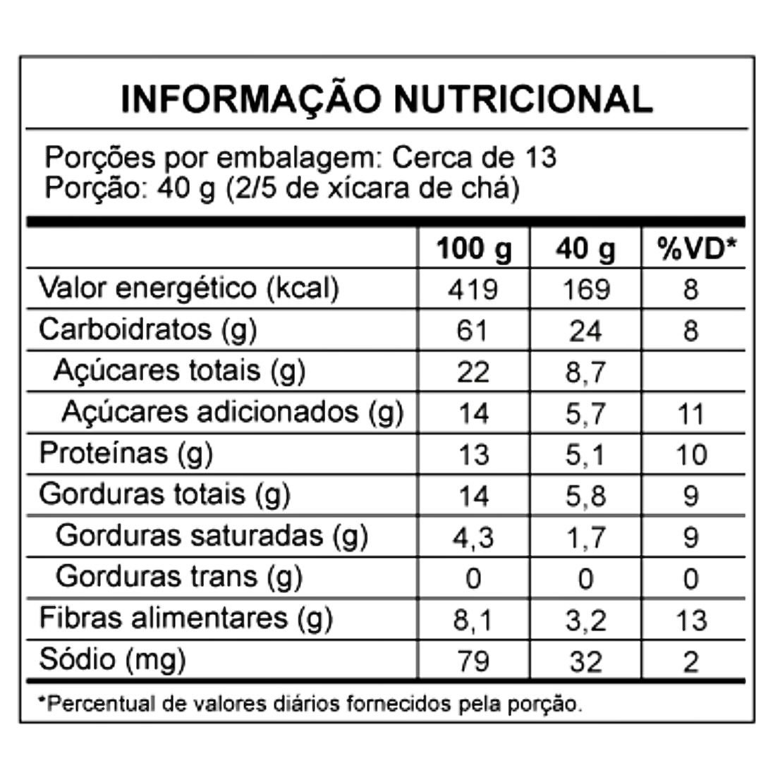 Ingredientes: Aveia integral, açúcar mascavo, coco, extrato de malte, castanha-do-Pará, semente de abóbora, cereja, castanha-de-caju, flocos de milho, uva-passa, semente de girassol, amêndoa, cranberry, óleo vegetal de palma, goji berry, gergelim, linhaça, quinoa, semente de chia, amaranto, fibra de trigo, sal, estabilizante maltitol e aroma natural.