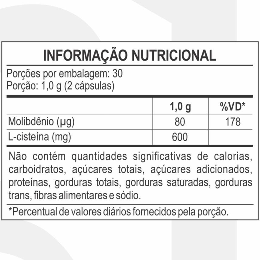 Fórmula com N-acetil L-cisteína (NAC) e Molibdênio. Potente ação antioxidante, suporte à desintoxicação hepática e fortalecimento do sistema imunológico.