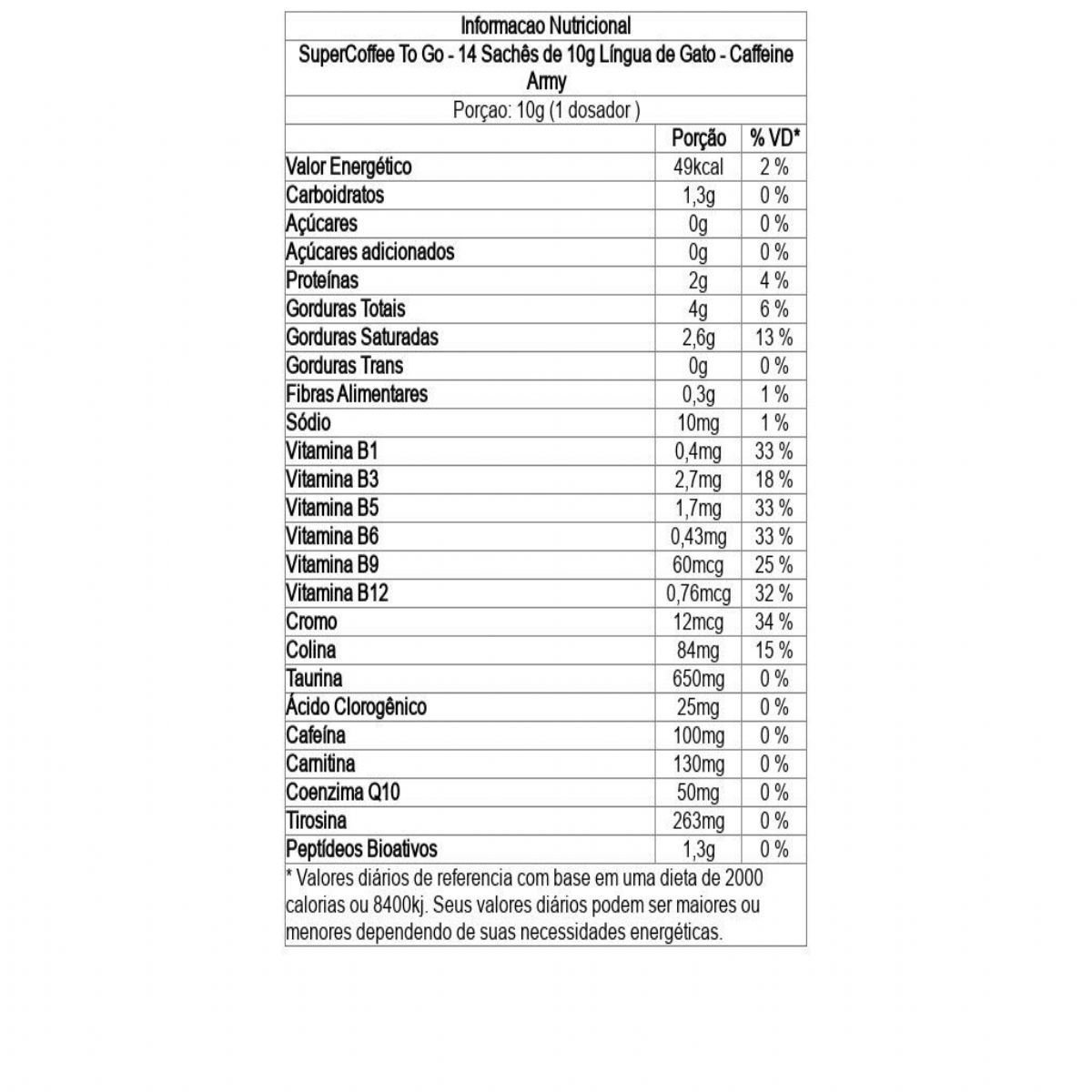 Ingredientes: Triglicerídeos de cadeia média C8 + C10 (TCM), colágeno hidrolisado, cacau alcalino em pó, taurina, L-tirosina, café verde moído, L-carnitina L-tartarato, cafeína microencapsulada, bitartarato de colina, café arábica solúvel, coenzima Q10, especiarias, complexo de vitaminas B (tiamina mononitrato (vitamina B1), nicotinamida (vitamina B3), D-pantotenato de cálcio (vitamina B5), cloridrato de piridoxina (vitamina B6), ácido N-pteroil-L-glutâmico (vitamina B9), cianocobalamina (vitamina B12)), picolinato de cromo, aromatizantes naturais, regulador de acidez bicarbonato de sódio e edulcorante glicosídeos de esteviol de Stevia rebaudiana Bertoni. ALÉRGICOS: CONTÉM DERIVADOS DE LEITE. PODE CONTER SOJA. NÃO CONTÉM GLÚTEN.