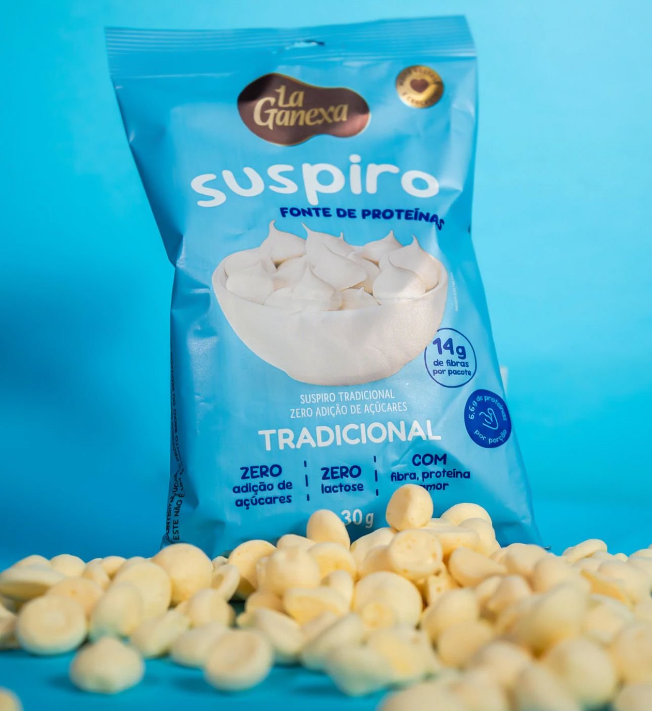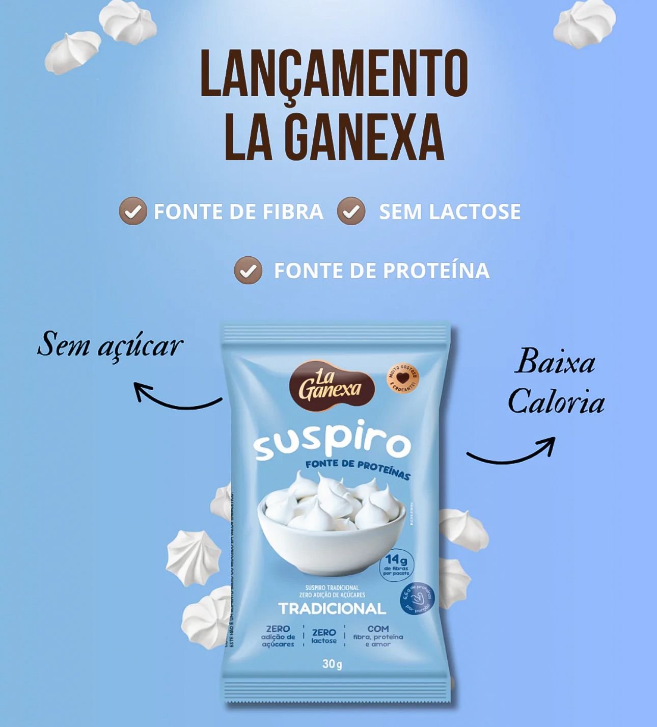 Zero açúcar, zero lactose, com fibras e proteínas! Leve, crocante e com baixa caloria, perfeito para um doce sem culpa. O sabor tradicional do suspiro, mas muito mais saudável!