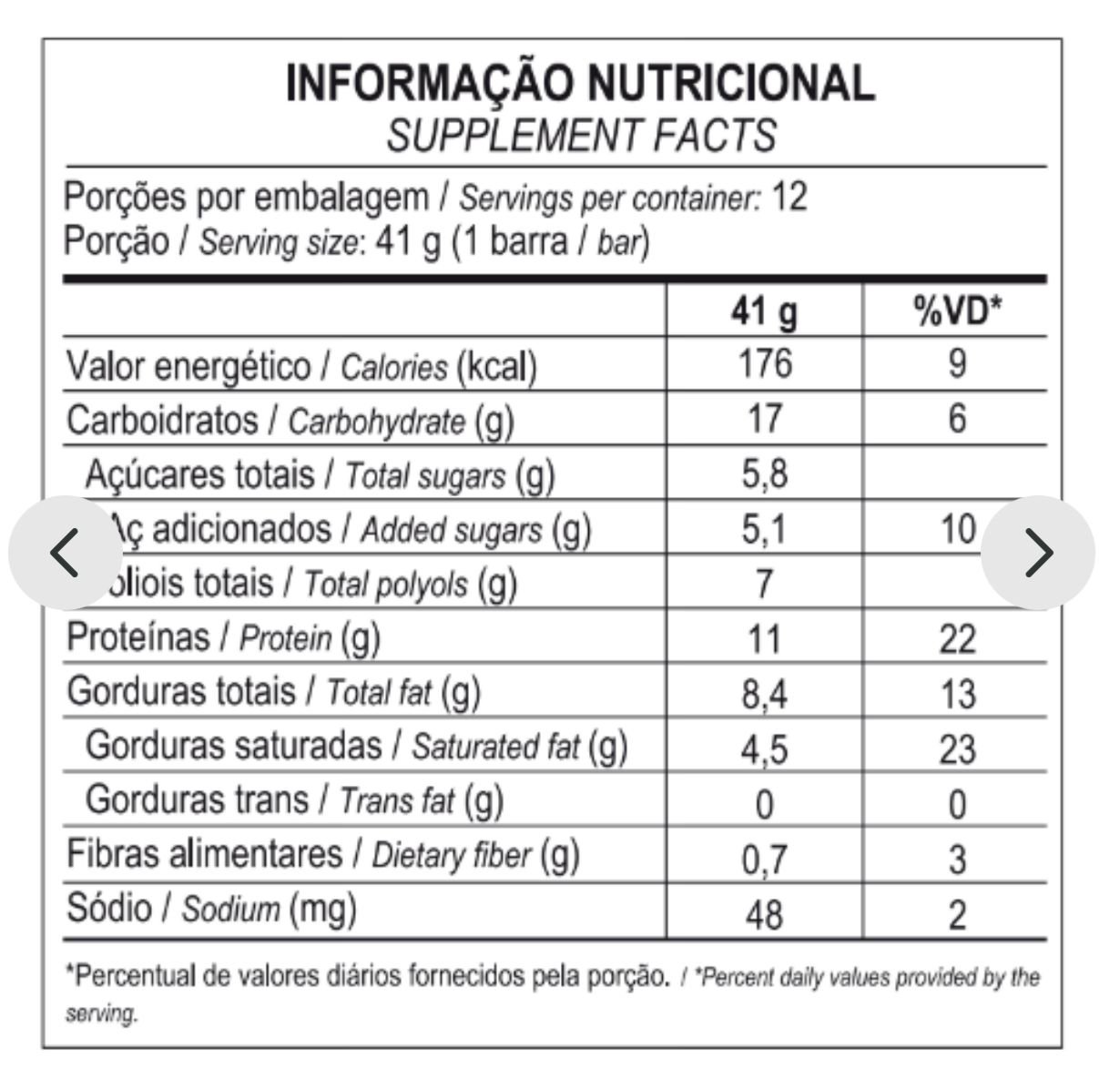 INGREDIENTES: Cobertura sabor chocolate ao leite, recheio de chocolate meio amargo, proteina concentrada do soro do leite, caseína, caseinato de cálcio, colágeno hidrolisado, óleo de girassol, cacau alcalino em pó, edulcorantes xarope de maltitol e sucralose, umectante glicerina, emulsificante lecitina de girassol, aromatizante e antioxidante DL-alfa-tocoferol. CONTÉM GLÚTEN.