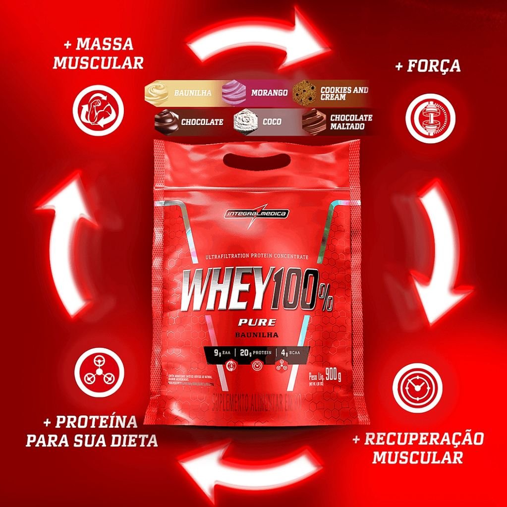 O Whey 100% Pure da Integral Médica é um suplemento proteico derivado do soro do leite, rico em aminoácidos essenciais e com alto valor biológico, ideal para quem busca ganho de massa muscular, recuperação e performance.